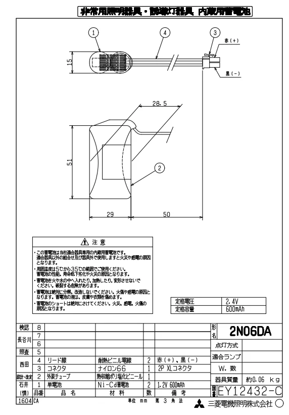 2N06DA相当品 電池屋 新品 三菱電機製誘導灯器具用交換電池 2.4V600mAh<年度シール付き> コネクター付きそのまま取付できます。- 在庫品【1~2営業日】で発送 ネコポス商品