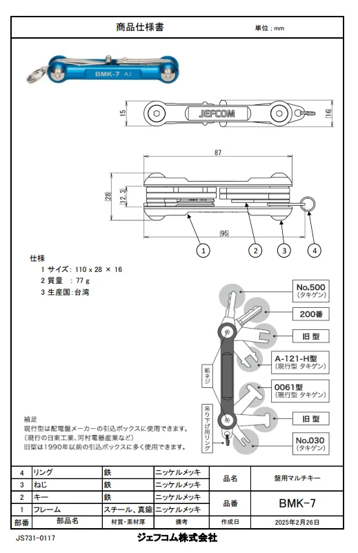 - 品番: BMK-7 ジェフコム 新品 盤用マルチキー