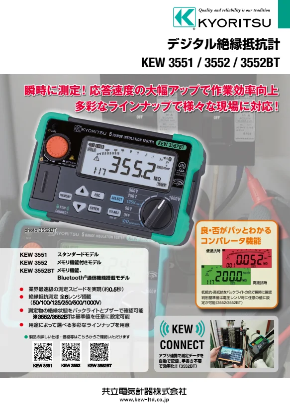 KEW 3552BT 共立電気計器 絶縁抵抗計 応答速度の大幅アップで作業効率向上!メモリ機能付 Bluetooth対応