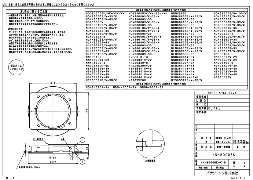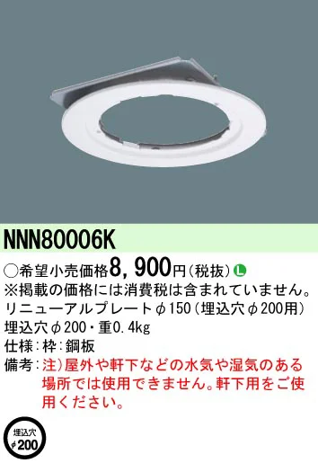 NNN80006K パナソニック リニューアルプレートφ150 埋込穴φ200用