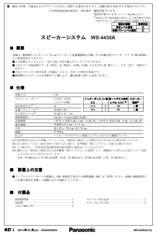 WS-4435A パナソニック 12cm 露出形天井スピーカー 音響設備 日本消防検定協会認定品