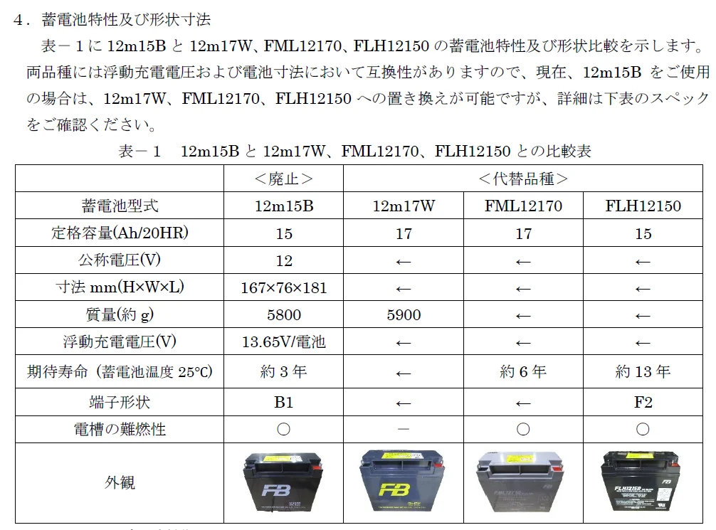 - 電圧容量:12V15Ah(20時間率)