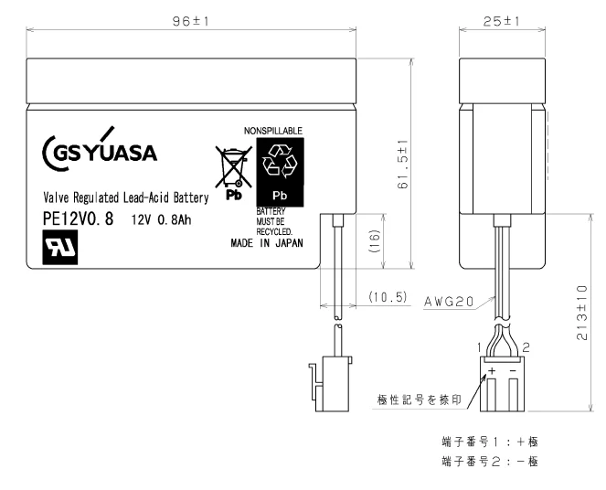 PE12V0.8 (W3) GSユアサ製 小形制御弁式鉛蓄電池 12V0.8Ah/20HR PEシリーズ