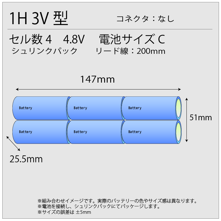 サイズ表記の無い組電池のサイズは使用するセルの種類によって異なります。ご注文後、当社で作成する組電池のサイズをご連絡いたしますので、ご確認をお願いいたします。