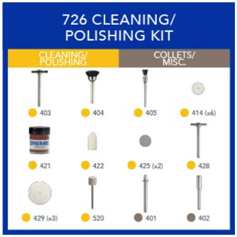 | 内容品・付属品 | ●マンドレル(401・402)×1●剛毛ブラシ(403・404・405)×1●カーボンスチールブラシ(428)×1●フェルト製ポリッシングホイール(414)×6●フェルト製ポリッシングホイール(422)×1●フェルト製ポリッシングホイール(429)×3●ポリッシングホイール(425)×2●ポリッシングホイール(425)(520)×1●ポリッシング用コンパウンド(421)×1 |