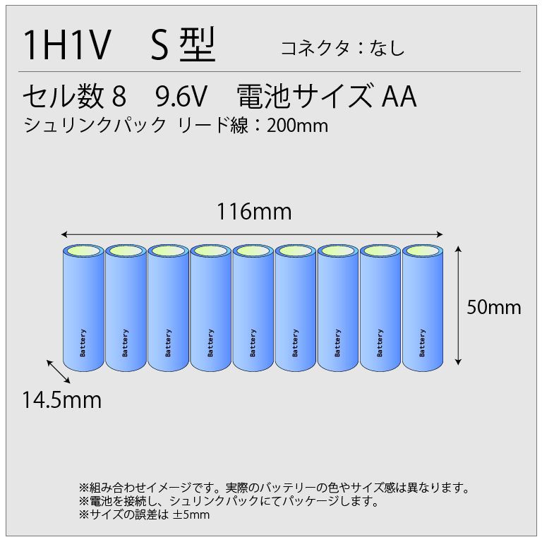 サイズ表記の無い組電池のサイズは使用するセルの種類によって異なります。ご注文後、当社で作成する組電池のサイズをご連絡いたしますので、ご確認をお願いいたします。