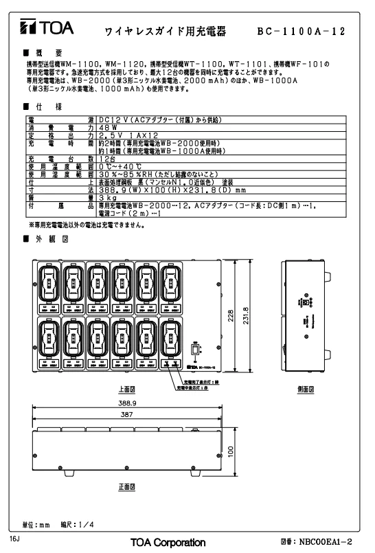 BC-1100A-12 TOA 最大12台同時充電対応 ワイヤレスガイド用充電器