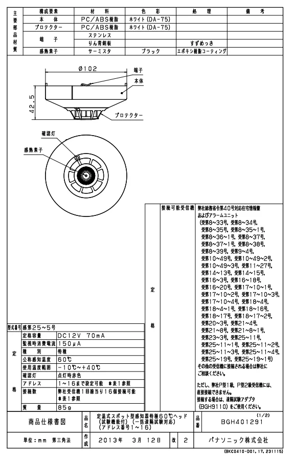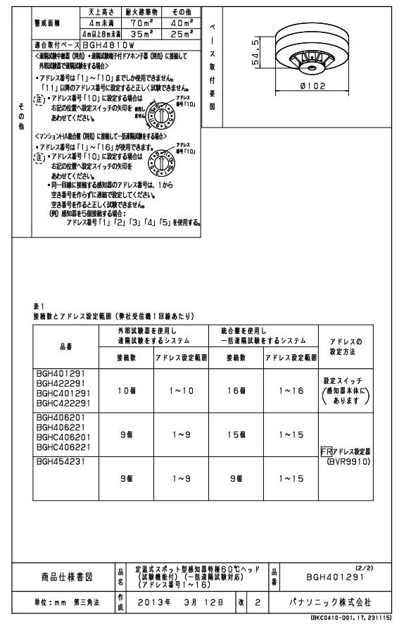 BGH401291 パナソニック 定温式スポット型感知器 特種 60℃ ヘッドのみ