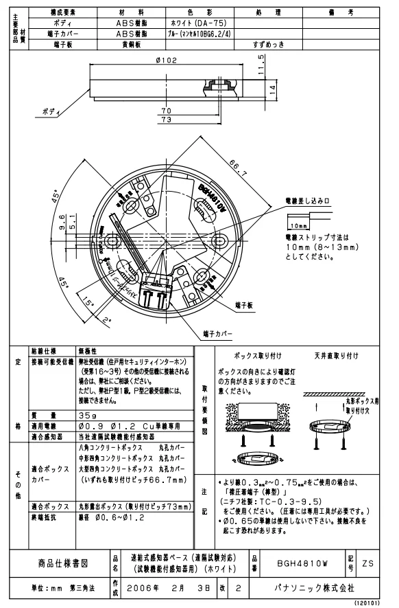 パナソニック 速結式感知器ベース(遠隔試験対応)(試験機能付感知器用)(ホワイト) BGH4810W