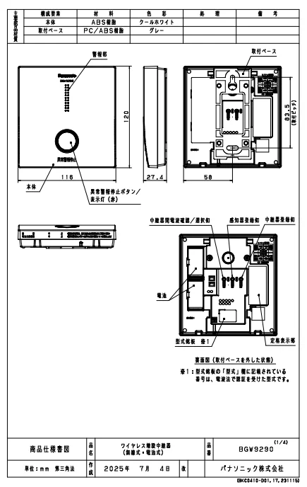 BGW9290 パナソニック 純正品 ワイヤレス増設中継器(無線式・電池式) Panasonic