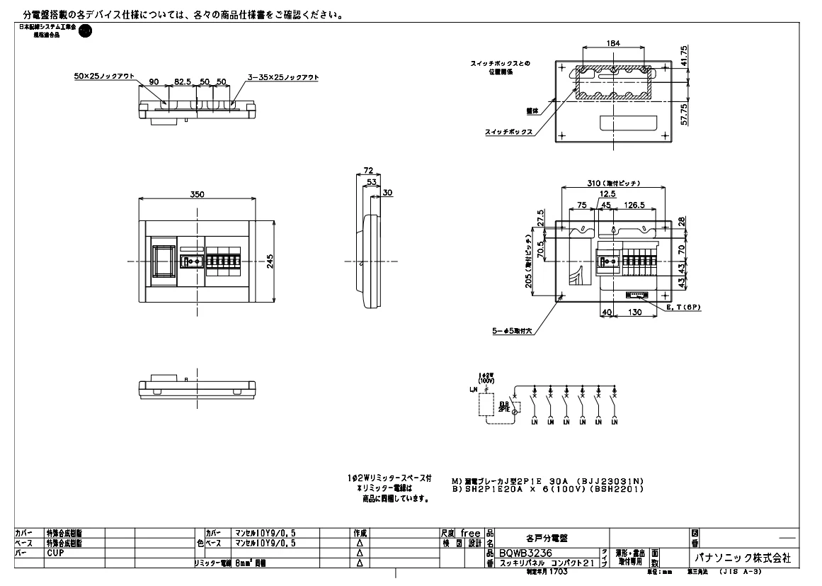 BQWB3236はパナソニックのリミッタースペース付スッキリパネルコンパクト21で、ヨコ1列露出形6+0 30Aです。
