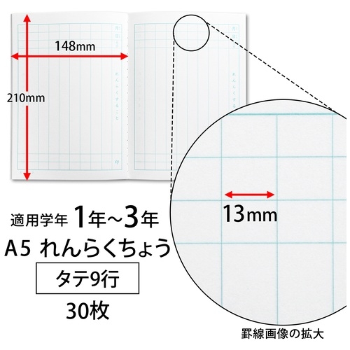 商品の詳細●外形寸法(縦)[mm]:210●外形寸法(横)[mm]:148●枚数[枚]:30●罫内容:タテ罫13mm●行数[行]:9●白色度:82%●製本形式:糸綴じ●対象学年:1~3年●規格:A5●種別:れんらくちょうタテ9行/ベルマーク運動参加商品●製造国:日本出荷/包装単位:1/10/240本体サイズ幅148mm×奥行き210mm×高さ3mm重量85g個装サイズ幅148mm×奥行き210mm×高さ3mm重量85g