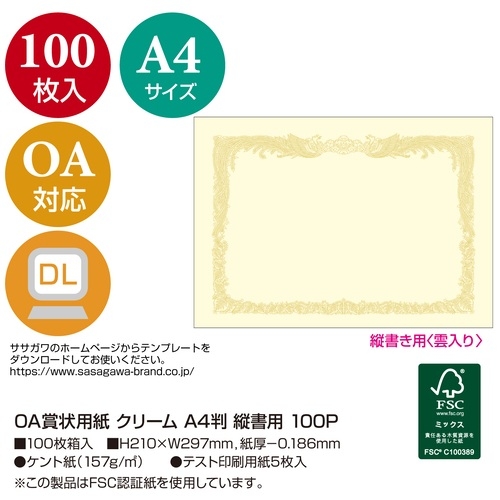10-1167 ササガワ 賞状用紙 10-1167 A4 縦書 100枚 4974268252692 分類:賞状用紙