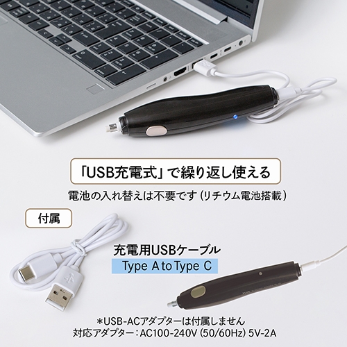 商品の詳細●外形寸法(幅)[mm]:147●外形寸法(奥)[mm]:25●外形寸法(高)[mm]:33●質量[g]:65●付属替えゴム:鉛筆用(白)5mm=6本、鉛筆用(白)2.3mm=10本、ボールペン用(砂)5mm=4本●電源:リチウムイオン充電池●仕様:USB充電式(リチウム電池搭載)●種別:本体●付属品:2.3mm用ホルダー、充電用USBケーブル(TypeA-TypeC)●材質:本体=ABS/色:ブラック/対応アダプター(別売):AC100-240V(50/60Hz)5V-2A出荷/包装単位:1/10/60本体サイズ幅147mm×奥行き25mm×高さ33mm重量67g個装サイズ幅175mm×奥行き97mm×高さ29mm重量130g