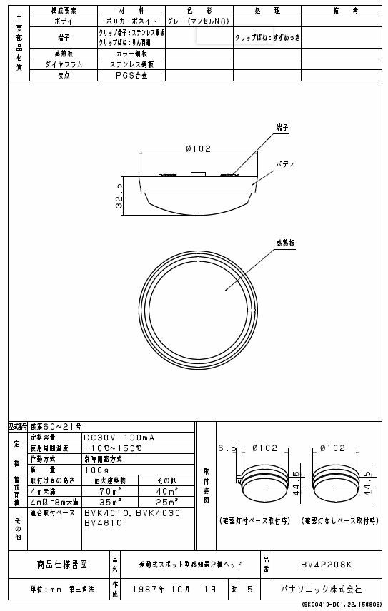 BV42208Kはパナソニック製の差動式スポット型感知器2種です。ヘッドのみベース別売りです。