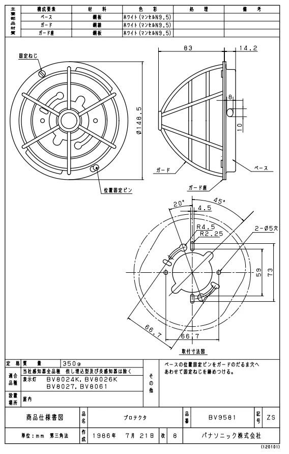 | 材 質 | ベース : 鋼板(t1.2)、ホワイト(マンセルN9.5) ガード : 鋼線(φ3、φ4)、ホワイト(マンセルN9.5) ガード座 : 鋼板(t1.2)、ホワイト(マンセルN9.5) |