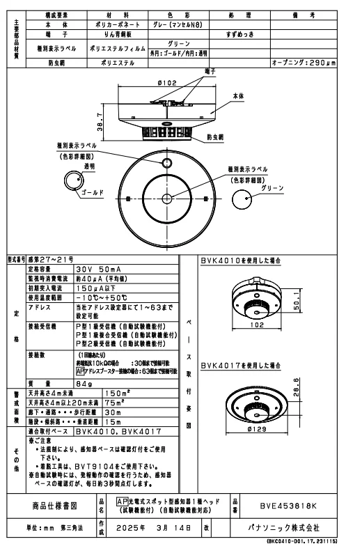 BVE453818K パナソニック 光電式スポット型感知器1種ヘッド(試験機能付)(自動試験機能対応)