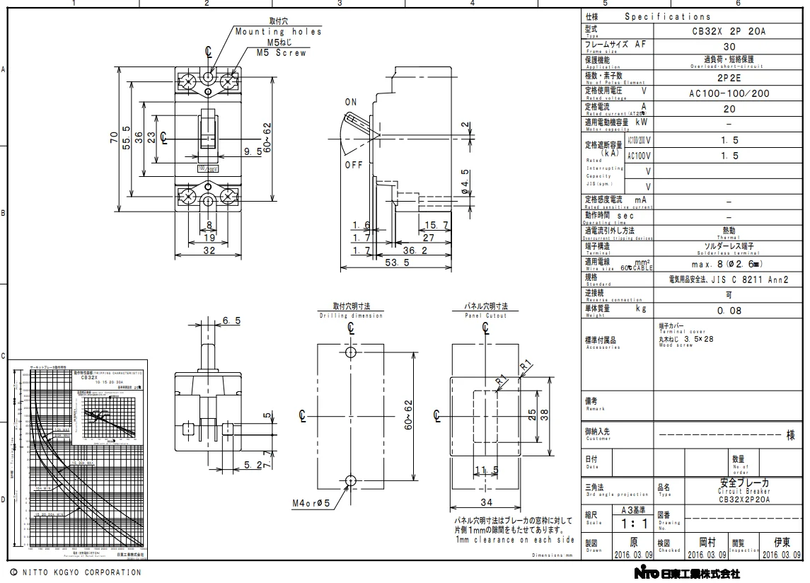 CB32X2P20A 日東工業 安全ブレーカー 2P 20A 2P2E