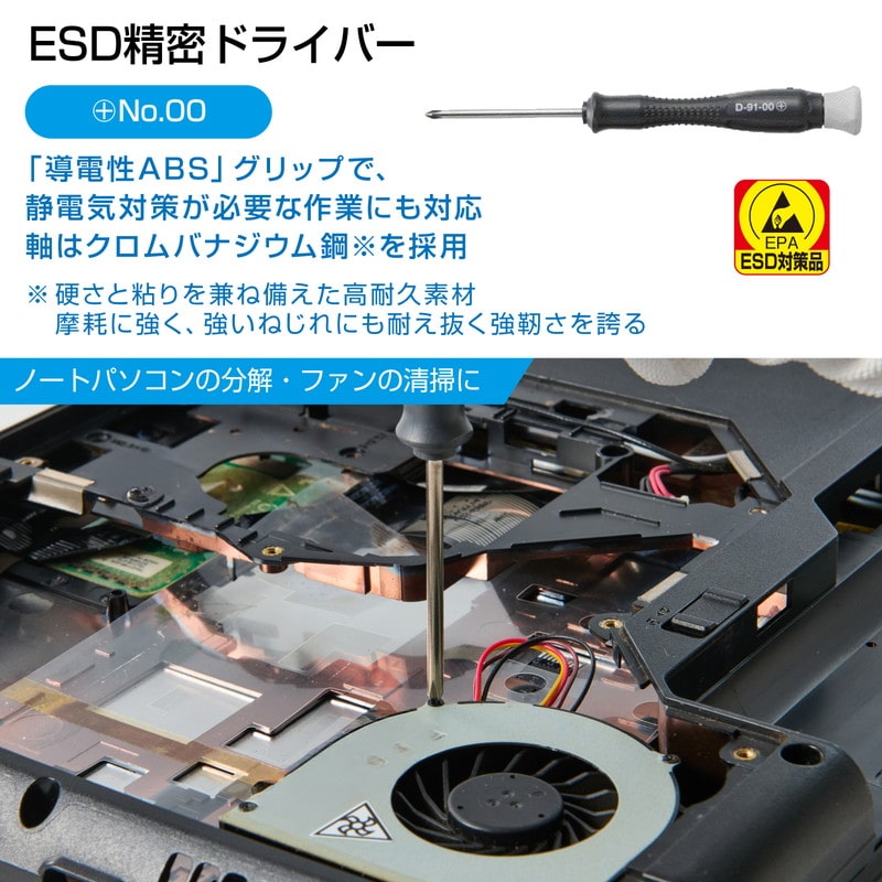グリップとキャップに導電性ABSを採用しているため、静電気対策が必要な作業にも対応できます。