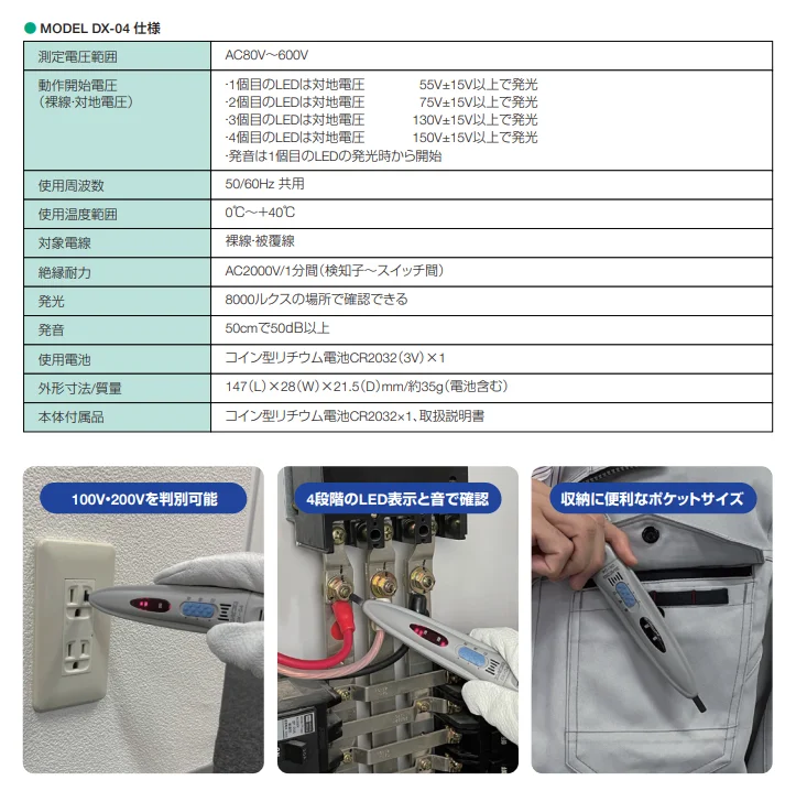 DX-04 低圧用検電器 共立電気計器 KYORITSU 100V 200V判別可能 被覆線と裸線の電圧をLED5段階で音と表示(DX04)
