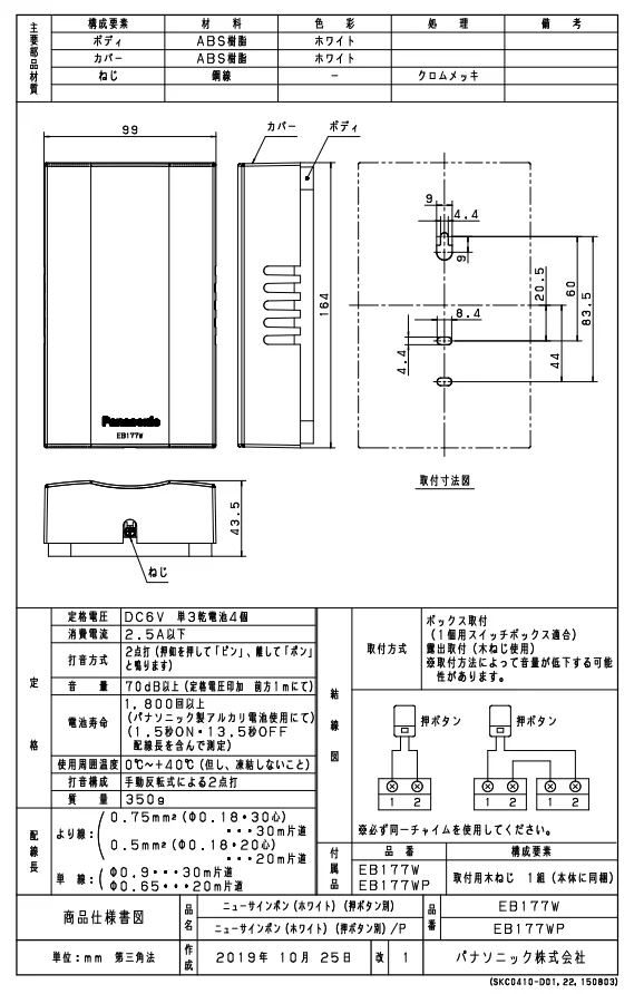 EB177W パナソニック 純正 ニューサインポン ホワイト 押ボタン別 パック無し AmazonPay支払い対応 Panasonic