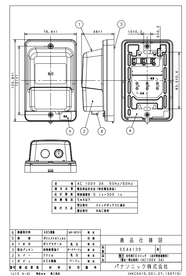 EE44139 パナソニック 電子 住宅用EEスイッチ 点灯照度調整形 露出・埋込両用