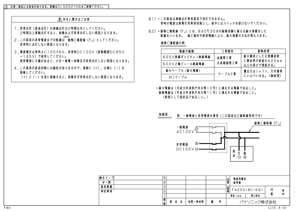 | 仕様・注意事項 | 電圧:100 V 消費電力:1.4 W 【本体】樹脂(ホワイト) 定格電圧:AC100V 非常時入力:DC100V 消費電力:1.4W(AC100V)/0.6W(DC100V) 入力電流:0.031A(AC100V)/0.007A(DC100V) 型式認定番号:1CM111-3377 同梱ランプ:FK91221A ランプモニタ(赤)付 ランプ交換の目安60000時間 表示面の明るさ(cd):10以上 天井直付型・壁直付型・天井吊下型、内照パネル式、B級・BL形(20B形)、片面型・電源別置形・一般型、避難口用片面型・左向・表示板別売り 【適合ガード(壁直付型)】FK02561Z (別売) 【適合L型金具】FK02788C (別売) ●側面取付する場合は適合L型金具をご使用ください。 ●天井直付する場合は天井面取付金具(同梱)を必ずご使用ください。 注)2線配線専用です。常用電源と非常用電源は共用配線で接続してください。 注)LEDにはバラツキがあるため、消防法の基準の範囲内で、表示面の見え方が異なる場合があります。 注)適合表示板にご注意ください。 |