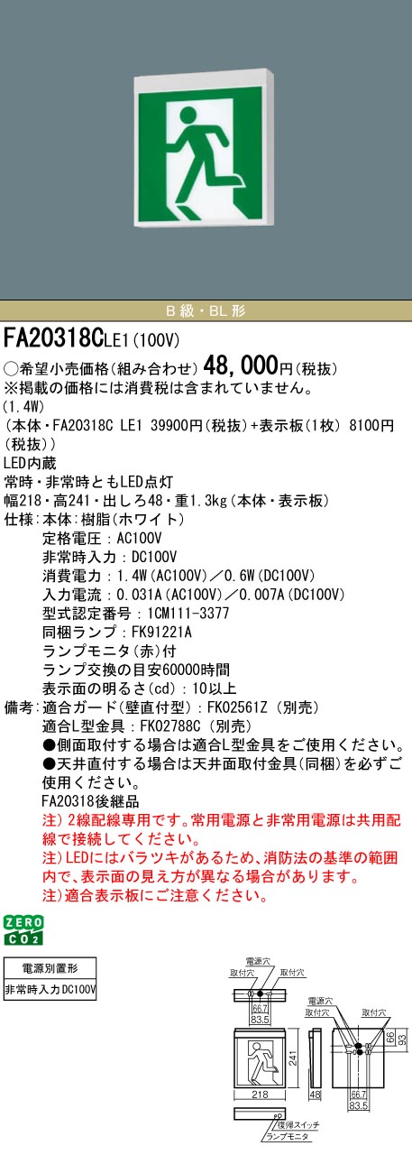 FA20318C LE1はパナソニック製誘導灯器具本体のみでパネル(適合表示板)は別売となります。