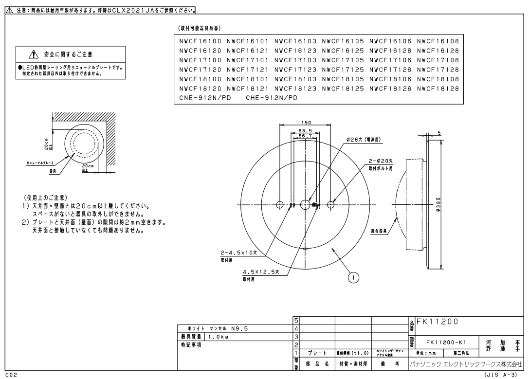 FK11200 パナソニック 新品 リニューアルプレート 防雨型シーリング(ブラケット兼用型)用 φ380
