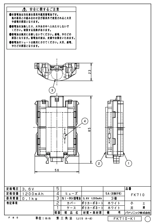 FK710はパナソニックメーカー純正品バッテリーです。電圧容量は2.4V1200mAhです。