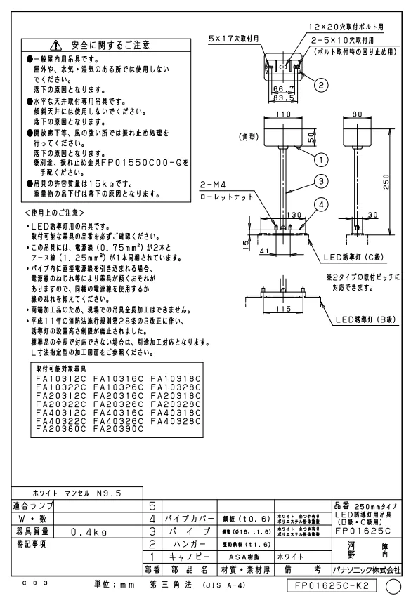 FP01625C パナソニック 誘導灯吊具 角タイプ 吊具 全長L250mm タイプ