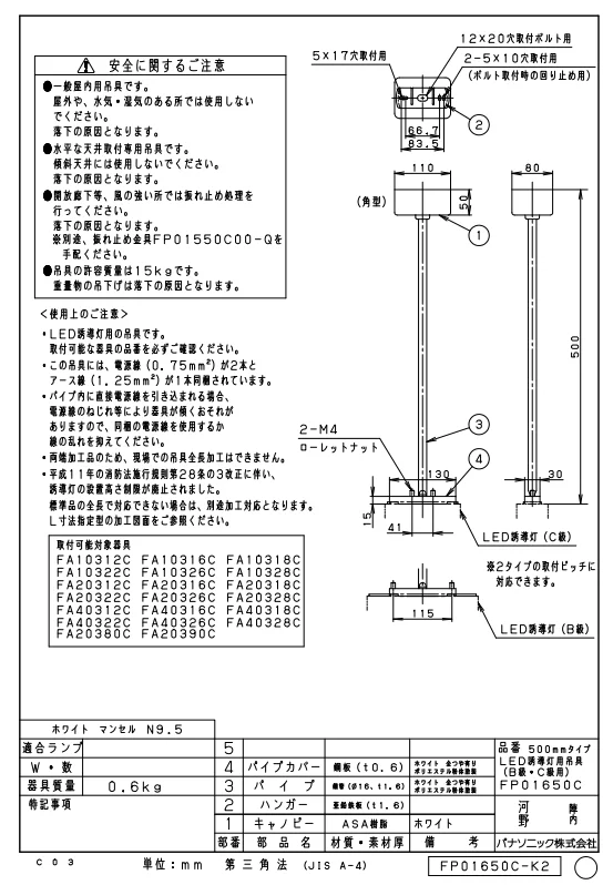 FP01650C パナソニック 誘導灯 吊具 角タイプ 吊具 全長L=500mm タイプ