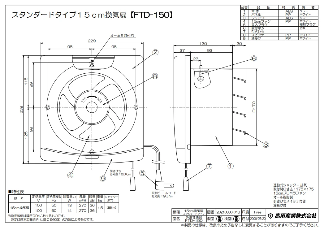 FTD-150 高須産業 台所・一般換気扇 スタンダードタイプ 連動式シャッター 排気 油受け付