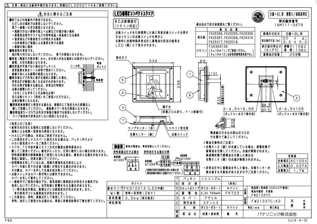 FW21337CLE1 壁直付型 パナソニック LED 誘導灯 片面型 ・ 一般型 ( 20分間 ) 防湿型 ・ 防雨型 ( HACCP兼用 )・ 自己点検機能付 ・ リモコン自己点検機能付 / B級 ・ BL形 ( 20B形 ) <パネル別売り 本体のみ>