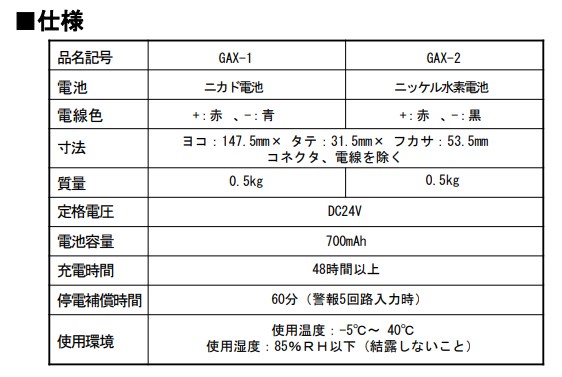 - その他: 停電補償時間60分(警報5回路入力時) 充電時間:48時間以上