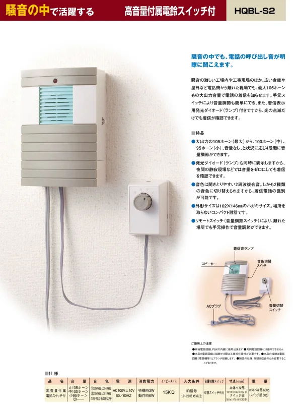 - AC100V使用によリ、最大約105ホ-ンの大出力から100ホ-ン(中)、95ホ-ン(小)、音量切の状況に応じた4段階に音量調節ができます。