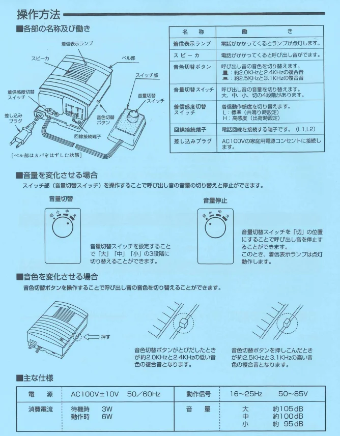 - 音色は聞き取りやすい2周波複合音、しかも2種類の音色に切替えられ、着信電話機の識別が可能です。