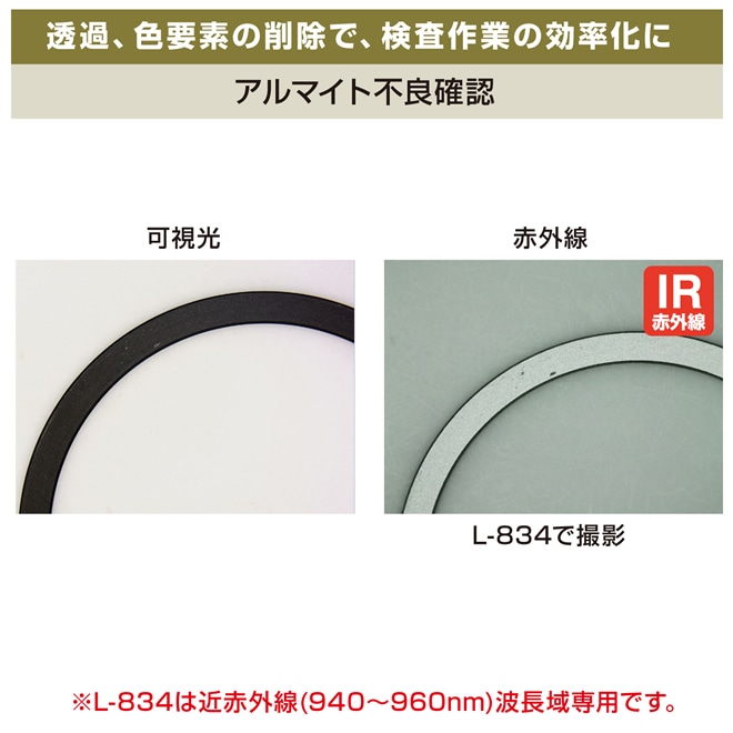 近赤外線波長域のみを観察できる500万画素USBカメラです。付属の赤外線リング照明と併用することで、通常の可視光域では観察しづらい着色された表面の傷や打痕・異物の検査、フィルムや液体の透過観察が可能です。
