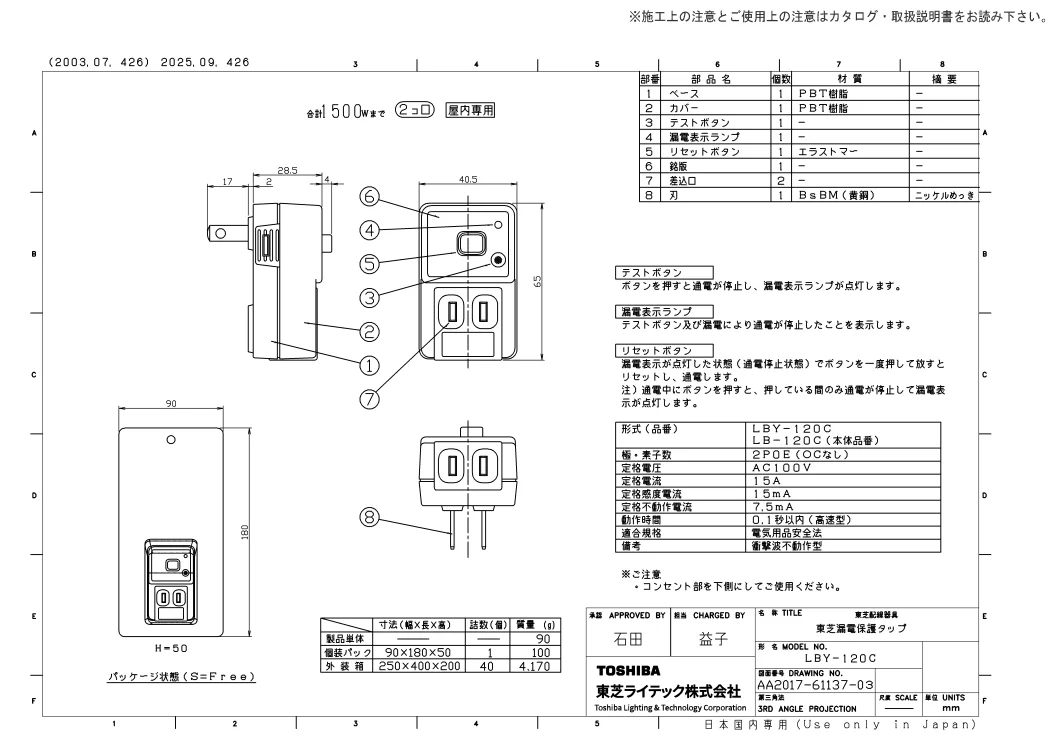 LBY-120C 東芝ライテック製 漏電保護タップ 【全国一律送料450円】
