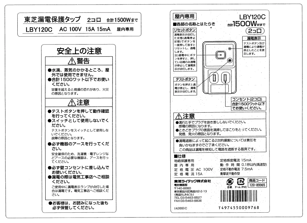 東芝ライテック製 漏電遮断タップ LBY-120C