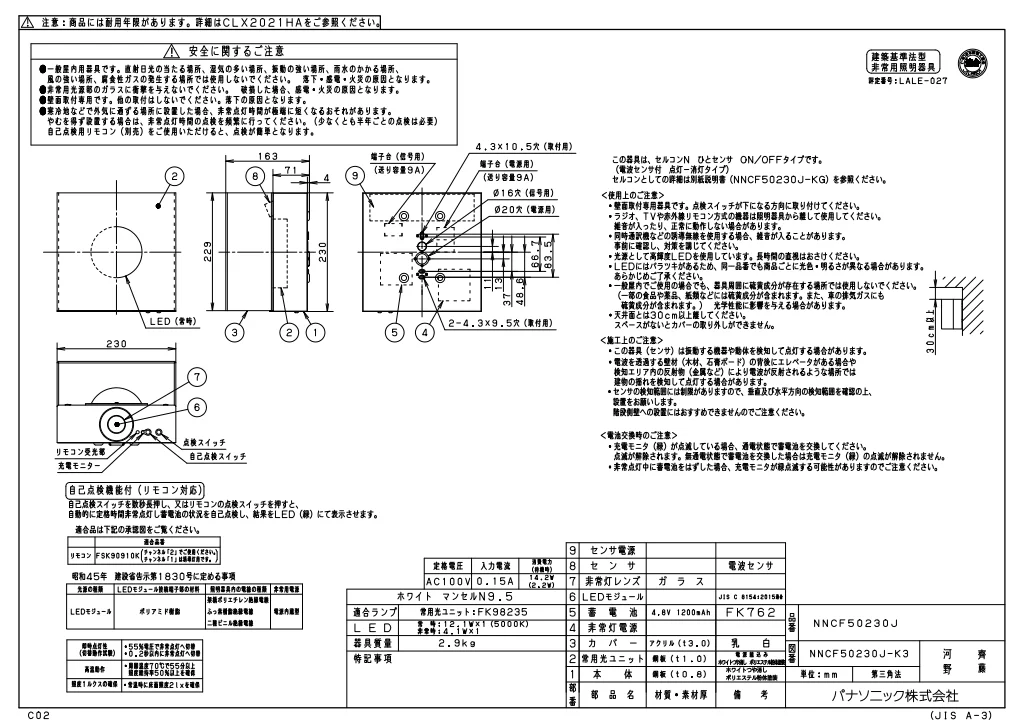 NNCF50230J LE1 パナソニック 壁直付型 LEDコンパクトブラケット階段通路誘導灯 30分間タイプ LED内蔵 電源ユニット内蔵 Panasonic