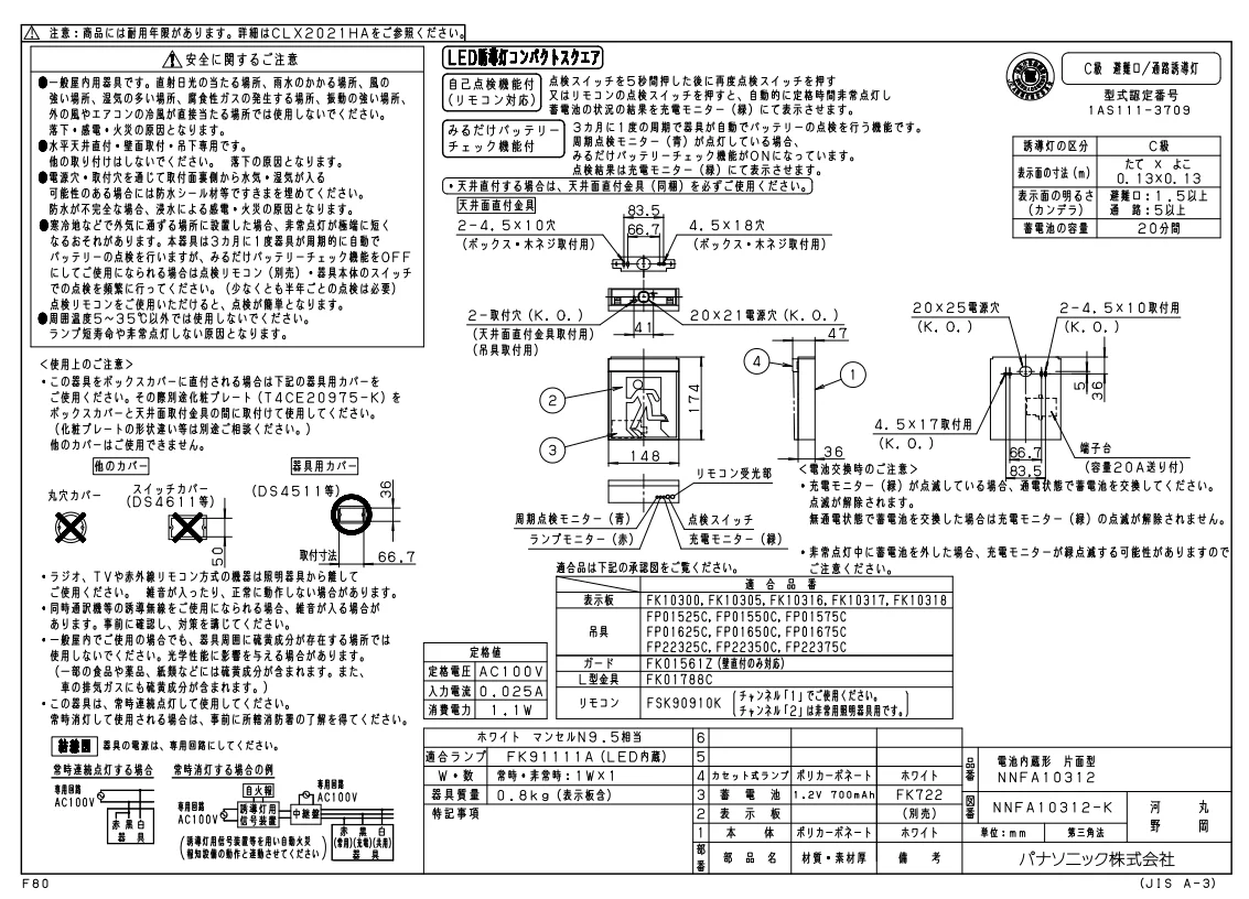 NNFA10312 LE1はパナソニック製誘導灯器具本体のみでパネル(適合表示板)は別売となります。