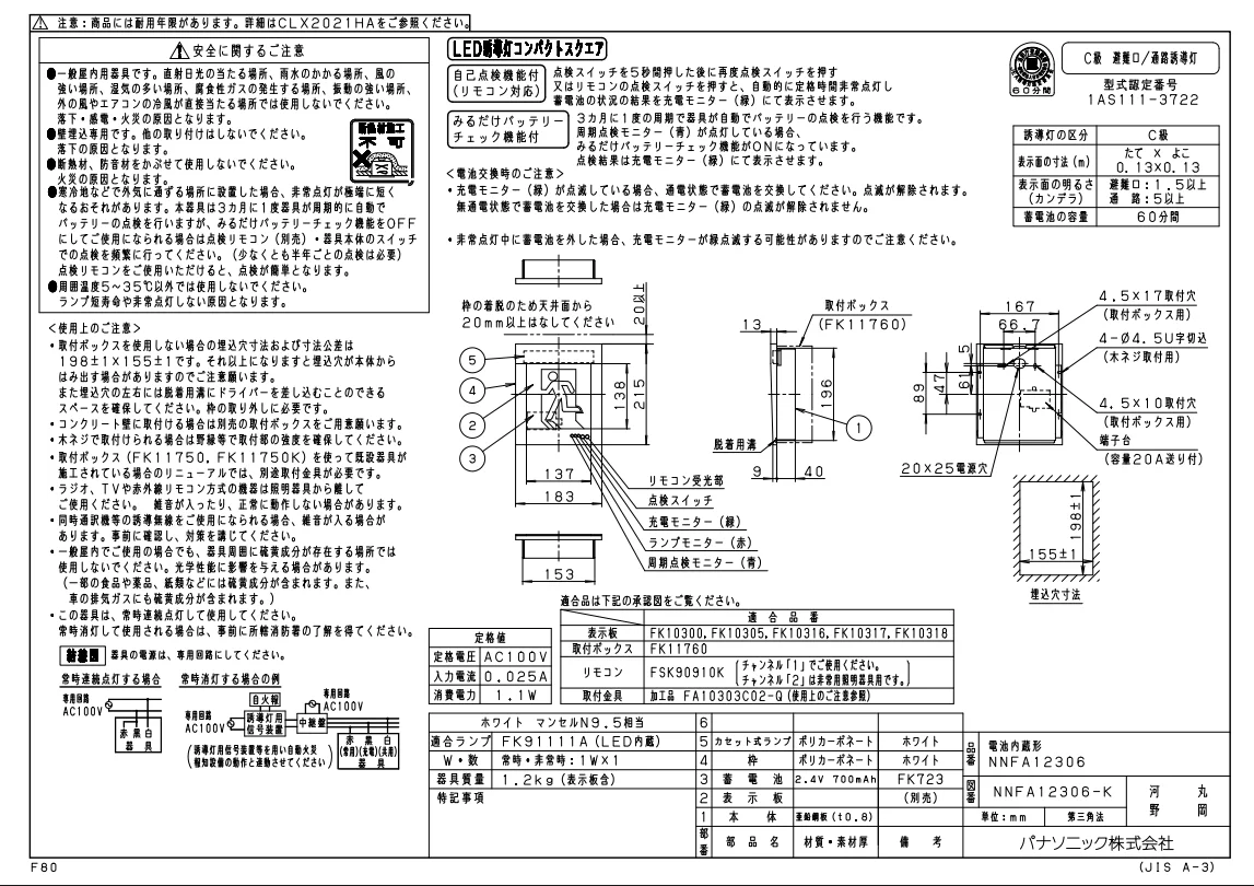 NNFA12306 LE1はパナソニック製誘導灯器具本体のみでパネル(適合表示板)は別売となります。