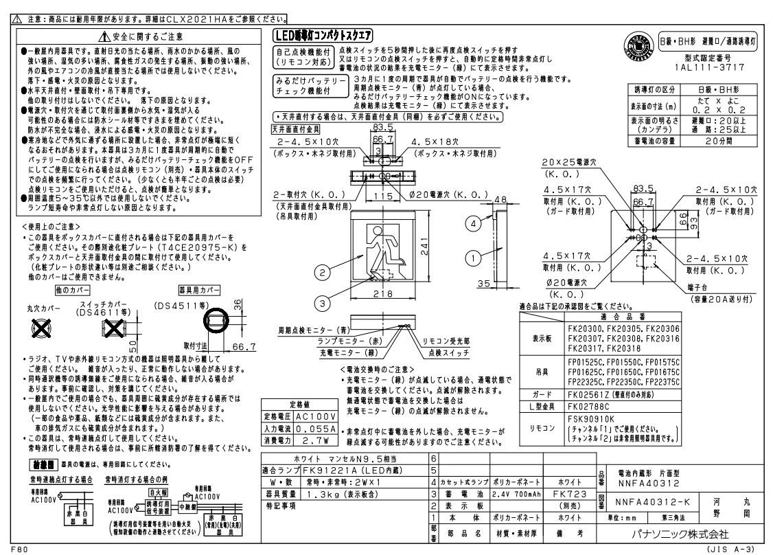 NNFA40312 LE1はパナソニック製誘導灯器具本体のみでパネル(適合表示板)は別売となります。