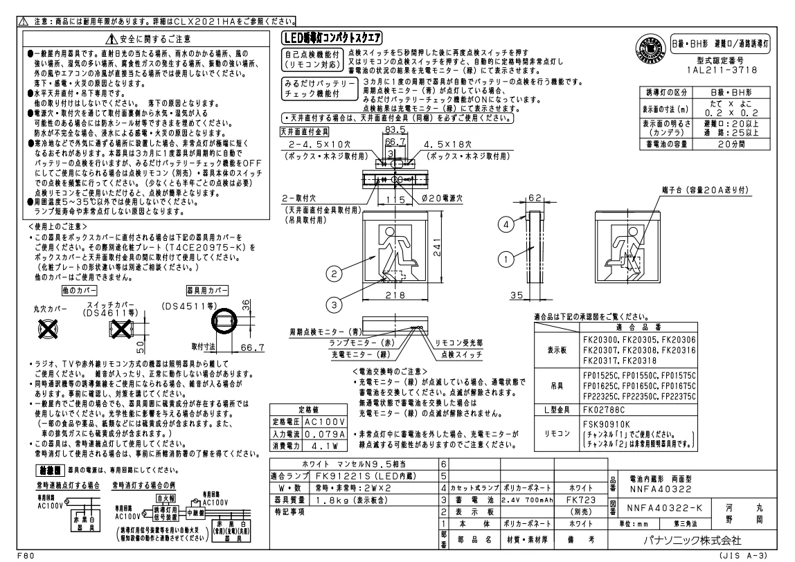NNFA40322 LE1はパナソニック製誘導灯器具本体のみでパネル(適合表示板)は別売となります。