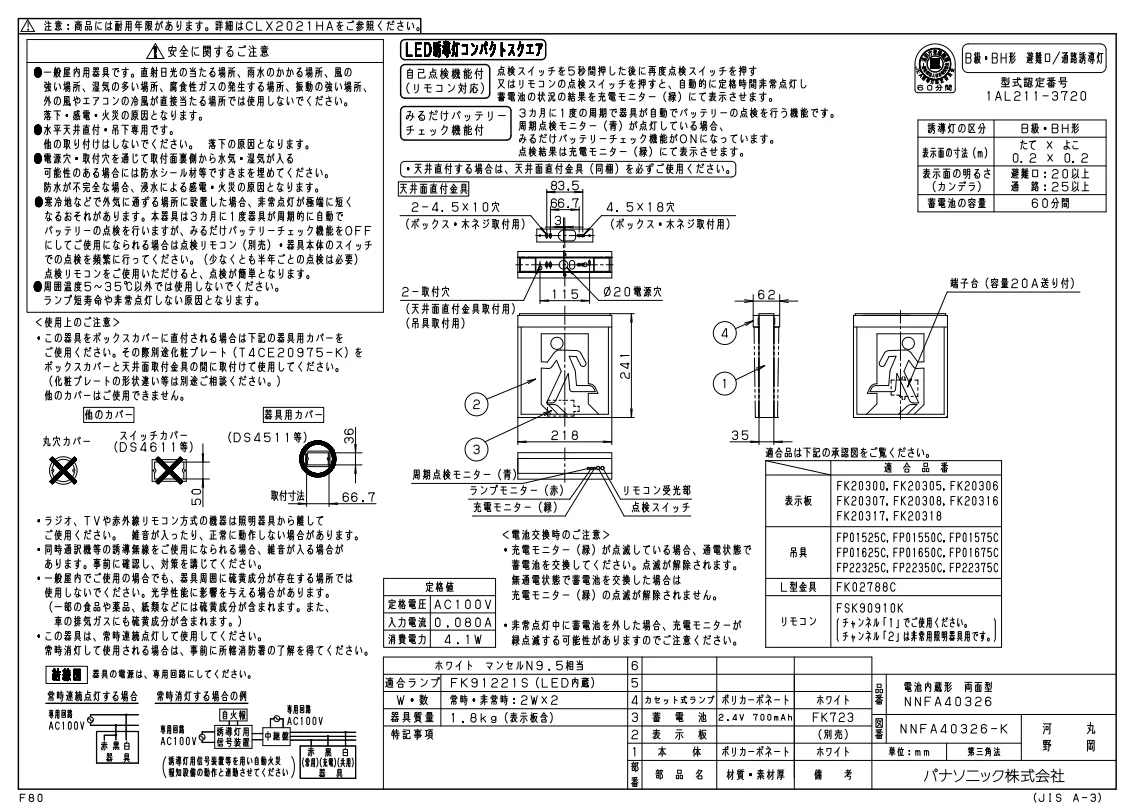 NNFA40326 LE1はパナソニック製誘導灯器具本体のみでパネル(適合表示板)は別売となります。
