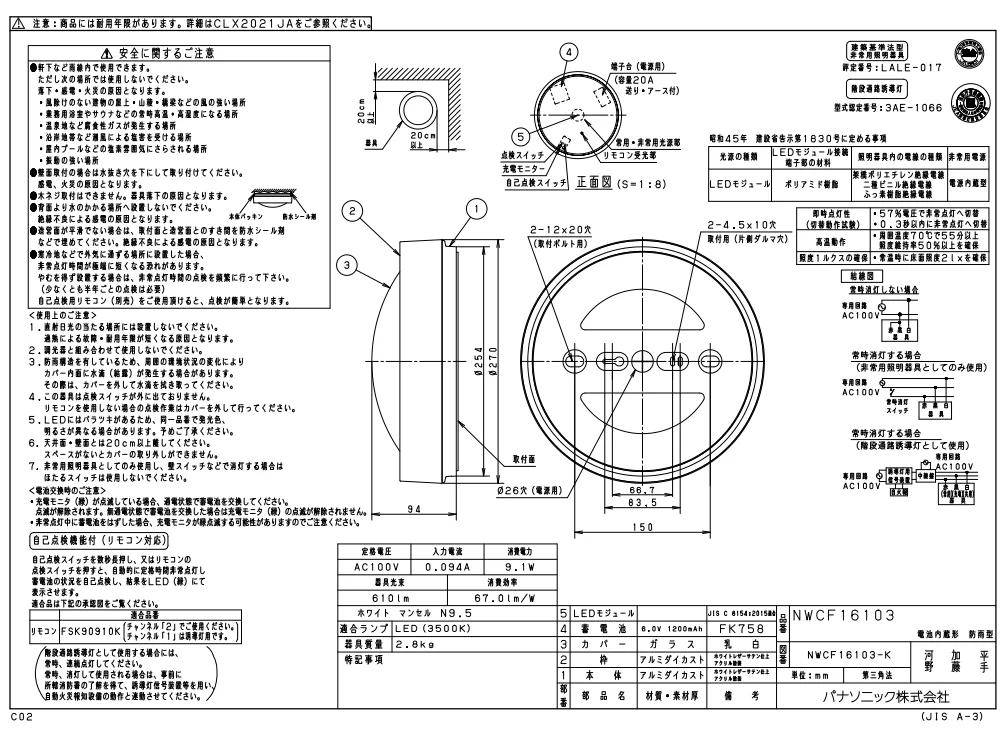 - 常時/非常時・本体組込LED点灯 色温度:3500 K 光束維持時間40000時間(光束維持率85%)