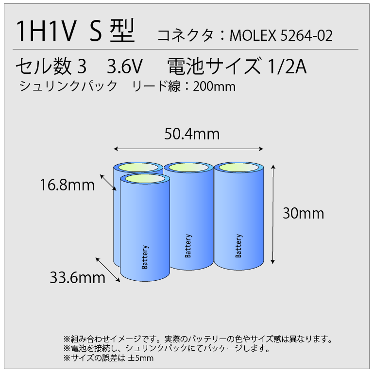 サイズ表記の無い組電池のサイズは使用するセルの種類によって異なります。ご注文後、当社で作成する組電池のサイズをご連絡いたしますので、ご確認をお願いいたします。