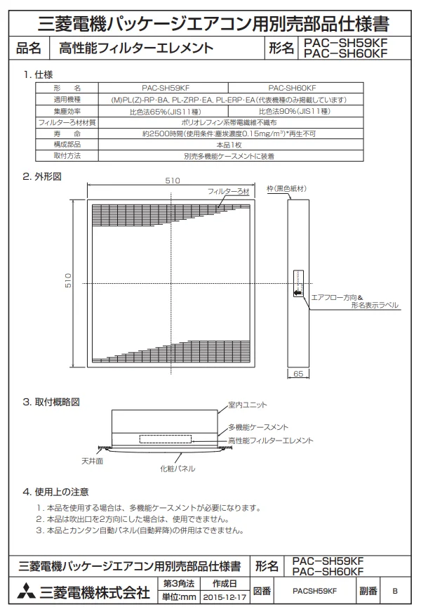 PAC-SH59KF 1枚ト 三菱電機 高性能フィルター 65% 店舗・事務所用パッケージエアコン(Mr.SLIM)