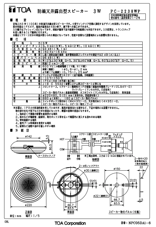 TOA 防滴型天井露出スピーカー3W 3W L級 W96 PC-2238WP